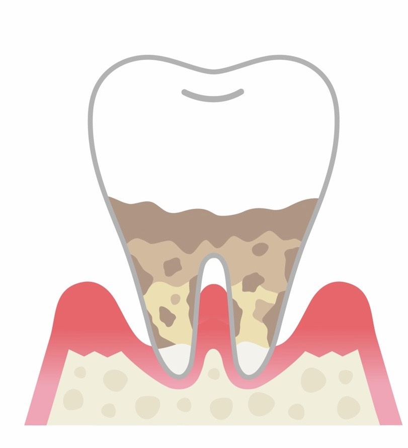 歯を支える骨の破壊が進み、歯周ポケットがさらに深くなります。歯茎が下がって歯が長く見えるようになったり、冷たいものがしみたりすることがあります。歯茎からの出血や口臭も強くなり、膿が出ることもあります。この段階になると、より専門的な治療が必要となります。